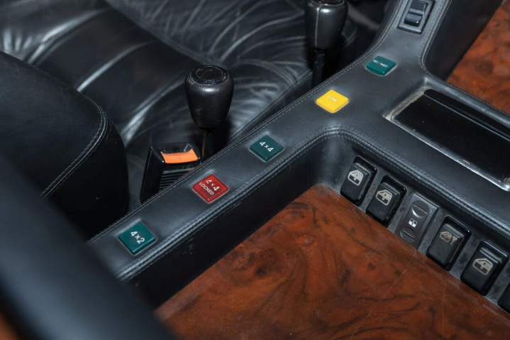 动力层面,这台孤品延续了兰博基尼的狂暴血脉。搭载的5.2升双顶置凸轮轴V12引擎,与Countach QV同源,配备六组韦伯化油器,2024年刚完成全面翻新,原厂输出高达455马力。与之匹配的是ZF五速手动变速箱,搭配双速分动箱,可实现后驱与四驱模式切换,三把自锁差速器更是将越野能力拉满——这份纯粹的机械质感,是如今电子化的Urus难以复刻的驾驶乐趣。